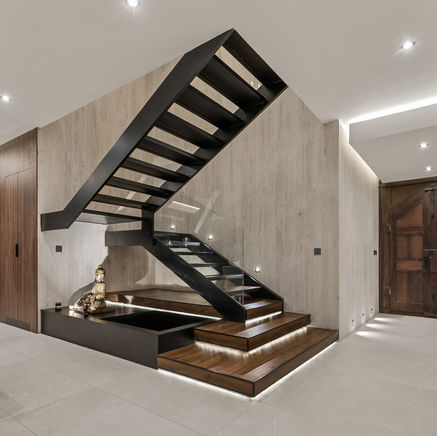 “En esta residencia se utilizó Mármol Travertino Xalapa en acabado al corte, dispuesto en placas verticales que refuerzan la esbeltez y elegancia de la volumetría principal. Su tono claro aporta luminosidad y continuidad, contrastando con la solidez del Mármol Negro Querétaro en basamentos y accesos. La combinación de ambas piedras genera un equilibrio entre ligereza y robustez, acentuando el carácter contemporáneo de la arquitectura.”
